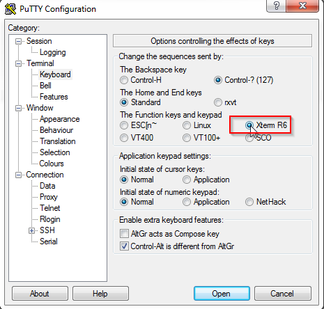 Go to you Putty preferences and alter your “Terminal – Keyboard” settings for the “function keys and keypad” to “Xterm R6”
