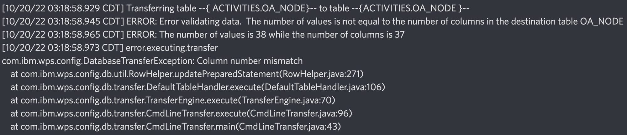 [10/20/22 03:18:58.929 CDT] Transferring table –{ ACTIVITIES.OA_NODE}– to table –{ACTIVITIES.OA_NODE }– [10/20/22 03:18:58.945 CDT] ERROR: Error validating data. The number of values is not equal to the number of columns in the destination table OA_NODE [10/20/22 03:18:58.965 CDT] ERROR: The number of values is 38 while the number of columns is 37 [10/20/22 03:18:58.973 CDT] error.executing.transfer com.ibm.wps.config.DatabaseTransferException: Column number mismatch at com.ibm.wps.config.db.util.RowHelper.updatePreparedStatement(RowHelper.java:271) at com.ibm.wps.config.db.transfer.DefaultTableHandler.execute(DefaultTableHandler.java:106) at com.ibm.wps.config.db.transfer.TransferEngine.execute(TransferEngine.java:70) at com.ibm.wps.config.db.transfer.CmdLineTransfer.execute(CmdLineTransfer.java:96) at com.ibm.wps.config.db.transfer.CmdLineTransfer.main(CmdLineTransfer.java:43)